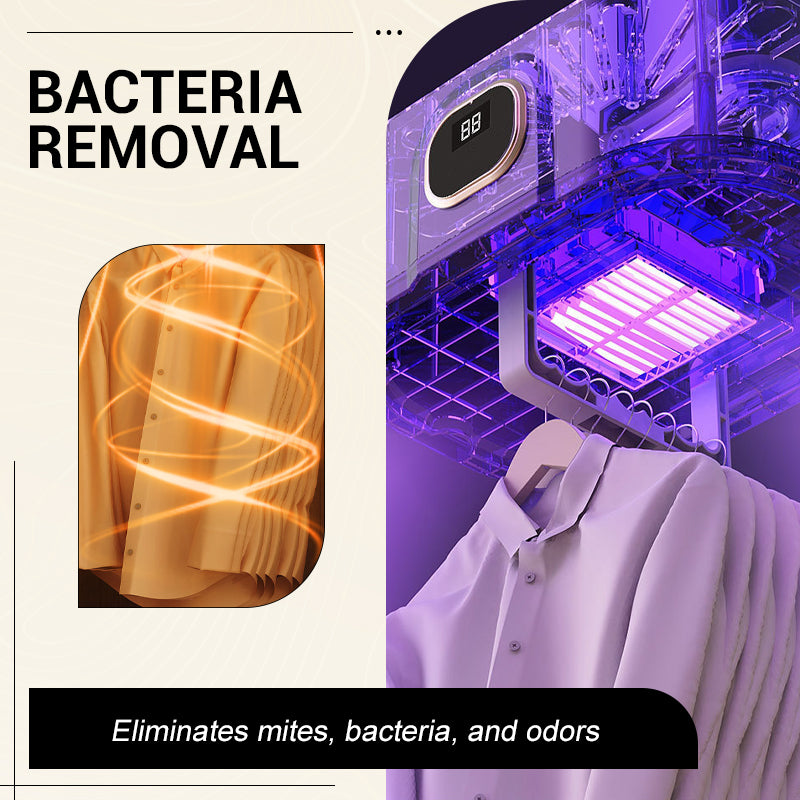 Het apparaat droogt niet alleen, maar helpt ook om alles schoon te houden. De hete lucht elimineert bacteriën en huisstofmijt, terwijl de ingebouwde negatieve ionentechnologie geurtjes neutraliseert. Dit zorgt ervoor dat uw kleding niet alleen droog is, maar ook hygiënisch veilig en fris ruikt.